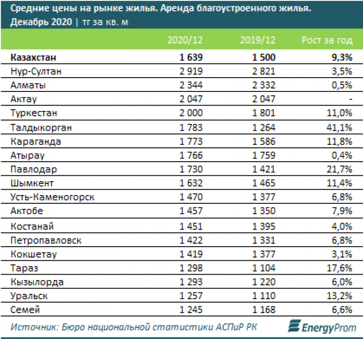 Среди крупных городов и мегаполисов страны самые высокие в секторе цены на аренду в Нур-Султане (2,9 тысячи тенге), Алматы (2,3 тысячи тенге) и Актау (2 тысячи тенге). А самые низкие в Семее (1,2 тысячи тенге за квадратный метр).