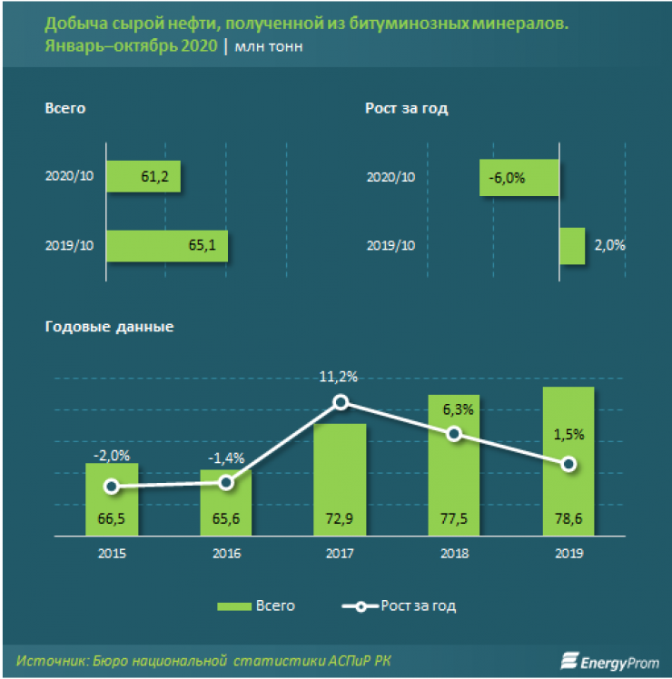 За январь - октябрь 2020 года в Казахстане добыли 61,2 миллиона тонн сырой нефти - на шесть процентов меньше, чем годом ранее. В денежном выражении объем добычи сырой нефти составил 6,5 триллиона тенге.