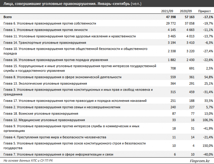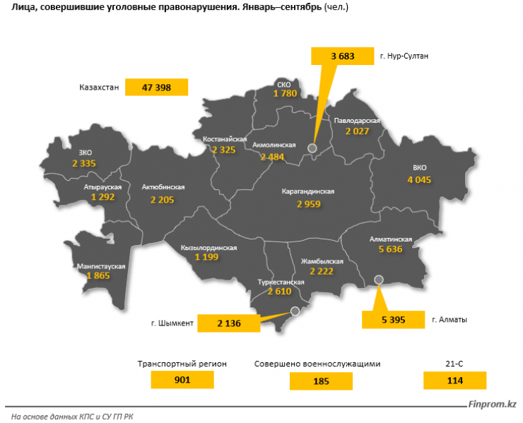 За январь – сентябрь 2021 года уголовные правонарушения в Казахстан совершили 47,4 тысячи человек - на 17,1 процента меньше, чем годом ранее. "Лидеры" в региональном разрезе - Алматинская область (5,6 тысячи человек, минус 14,2 процента за год), Алматы (5,4 тысячи человек, минус 13,3 процента), а также Восточно-Казахстанская область (4 тысячи человек, минус 22,3 процента).