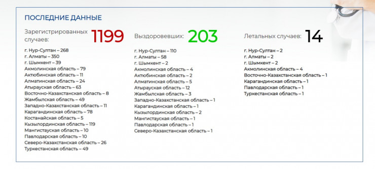В этой связи просим считать общее число заболевших 14 апреля в Туркестанской области 5, общее число подтвержденных диагнозов КВИ по Туркестанской области считать 49, а общее число по Казахстану - 1199", - говорится в сообщении.