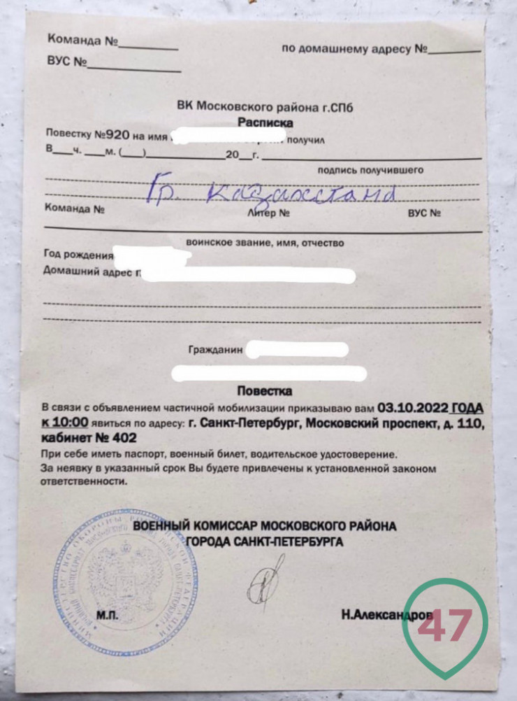 Ранее в региональном СМИ Ленинградской области появилась информация, что 31-летний казахстанец, проживающий в Санкт-Петербурге, получил повестку от коммунальных служб своего района. По сообщению СМИ, казахстанец проживает в России с 2013 года, в 2017 году получил вид на жительство, но при этом казахстанское гражданство он не менял. Казахстанец показал паспорт и отказался подписывать какие-либо документы и приходить в военкомат. Вместо этого он обратился в консульство.