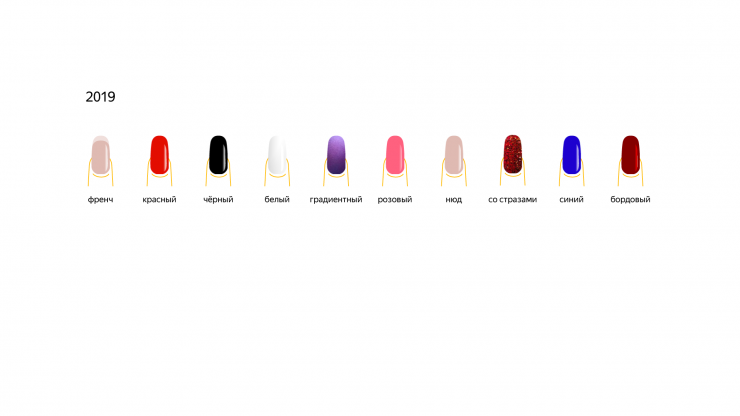 Несмотря на то что в последние три года список вариантов маникюра практически не менялся, аналитикам удалось выяснить некоторые особенности. Например, в 2017-м стали гораздо больше спрашивать про черный маникюр, в 2018-м - про нюд. В прошлом году в моде был жёлтый лак, разноцветные и оранжевые ногти.