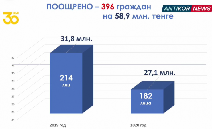 За последние два года территориальными органами Антикоррупционной службы поощрено 396 граждан на общую сумму 58 900 000 тенге.