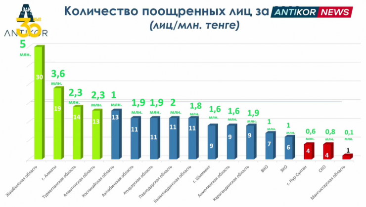 Наибольшая результативность по поощрению граждан отмечается в департаментах по Жамбылской области (30 лиц - 5 009 910 тенге), Алматы (19 лиц - 3 566 226 тенге), Туркестанской (14 лиц - 2 344 770 тенге) и Алматинской областям (13 лиц - 2 328 280 тенге)", - сообщил Бигайдаров.
