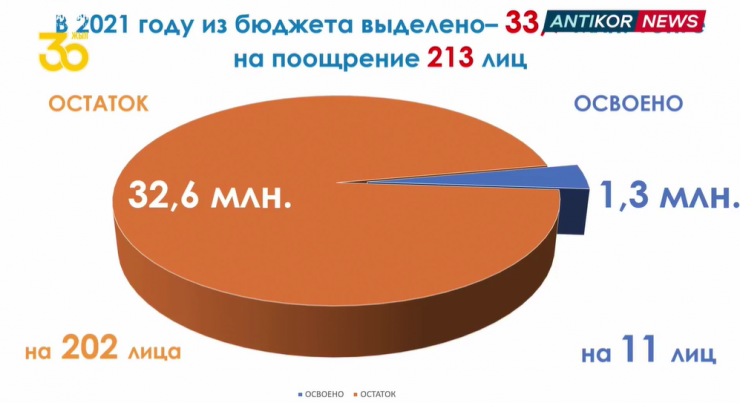"В текущем году из бюджета выделено 33 900 000 тенге на поощрение 213 лиц. За январь территориальными департаментами поощрено 11 лиц на сумму 1 306 740 тенге", - сообщил Данияр Бигайдаров.