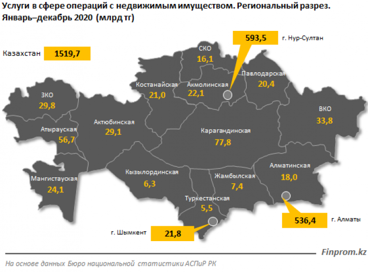 Среди регионов почти три четверти услуг, связанных с недвижимым имуществом, приходится на два крупнейших мегаполиса Казахстана - Нур-Султан и Алматы, сообщает портал.