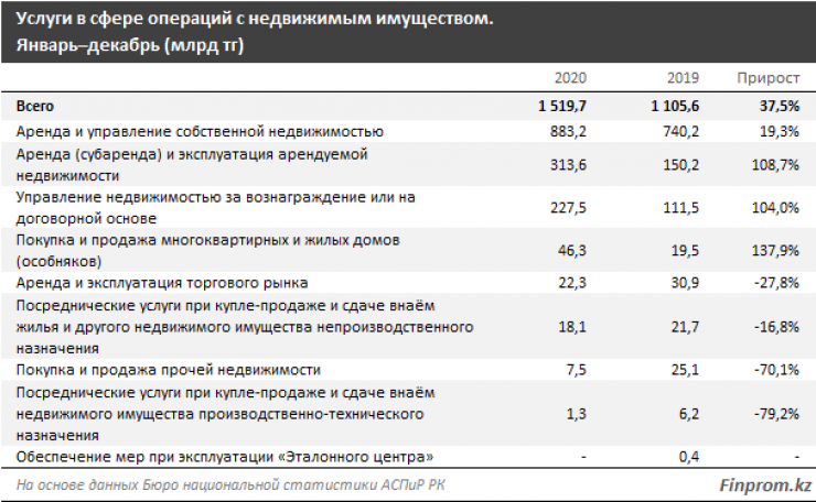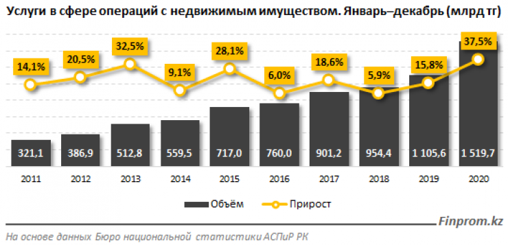 По данным аналитиков, услуги в сфере операций с недвижимым имуществом за январь - декабрь 2020 года составили 1,52 триллиона тенге. По сравнению с прошлым годом показатель увеличился в денежном выражении на 37,5 процента. Реальный рост превысил 41 процент, это самый высокий показатель за все время.