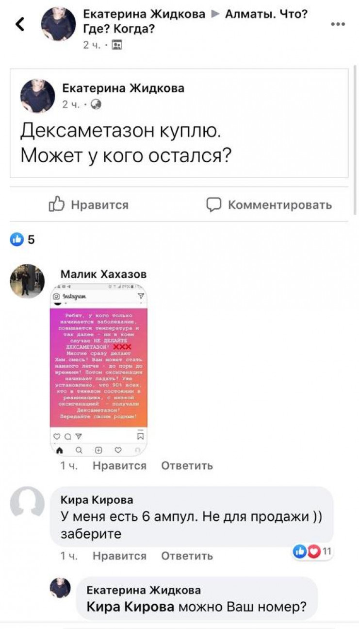 В Facebook в группе "Алматы. Что? Где? Когда?" Екатерина Жидкова написала: "Дексаметазон куплю. Может, у кого остался". В комментариях под постом нашлось несколько отзывчивых пользователей, который были готовы безвозмездно отдать лекарства.