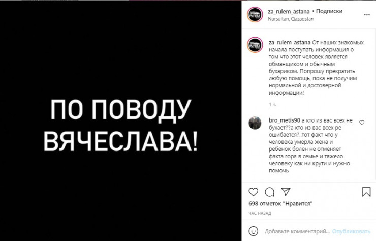 Позже в одном из столичных пабликов в Instagram казахстанцев призвали приостановить сборы средств для Вячеслава из-за информации, что "человек является обманщиком". Администратор страницы при этом отметил, что ожидает достоверной информации.