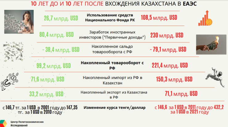 Казахстанский эксперт Рахимбек Абдрахманов сравнил экономические показатели Казахстана до вступления в ЕАЭС и после. По его данным, национальная валюта по отношению к доллару в 2001-2010 годы ослабла всего на один тенге. А в период с 2011 по 2021 год, а большую часть этого отрезка страна состоит в ЕАЭС, тенге обесценился почти в три раза.