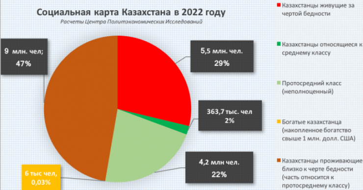 По словам Абдрахманова, в результате таких экономических явлений в Казахстане сложилась следующая социальная структура: в стране бедных людей около 15 миллионов человек.
