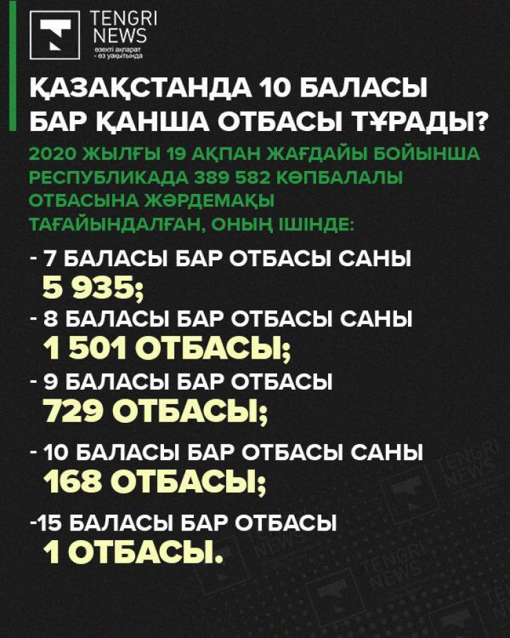 2020 жылғы 19 ақпан жағдайы бойынша Республикада 389 582 көпбалалы отбасына жәрдемақы тағайындалған. Сонымен, Еңбек және халықты әлеуметтік қорғау министрлігінің мәліметінше, елдегі көпбалалы отбасылар саны мынадай: