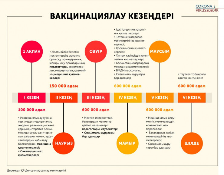 Бұл туралы денсаулық сақтау министрі Алексей Цой Үкімет отырысында айтты. Министрдің сөзінше, алғашқы жартыжылдықта 2 миллион адамды вакцинациялау жоспарланған. Жалпы вакцинация 6 кезеңге бөлінеді.