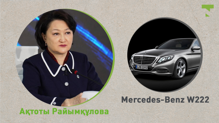 Mercedes мініп жүрген министрлер арасында Мәдениет және спорт министрлігінің басшысы Ақтоты Райымқұлова бар. Оның қызметтік көлігі - 2014 жылы шыққан Mercedes-Benz W222.