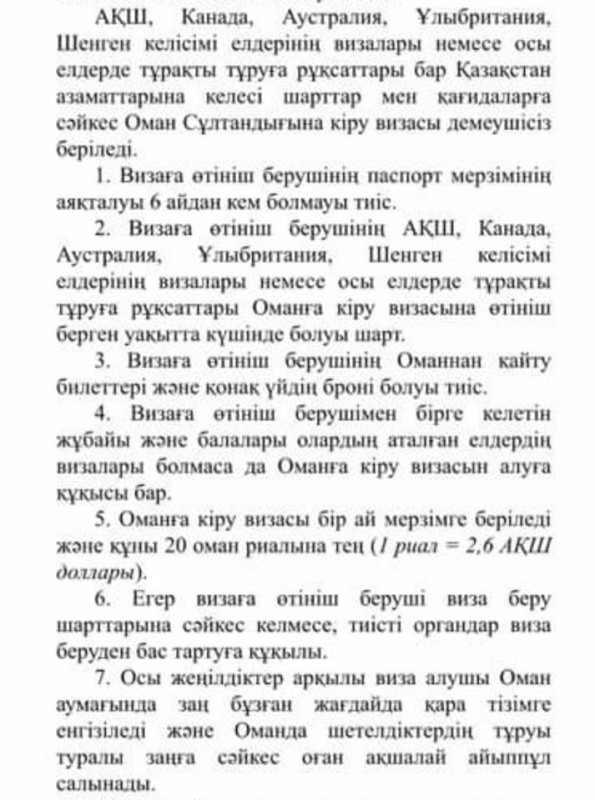 "Отныне казахстанцы, имеющие визы или вид на жительство Великобритании, США, Канады и Австралии либо стран Шенгенской зоны, могут получить оманскую туристическую визу сроком на 30 дней без приглашения. Главное требование - наличие обратного билета и подтверждение брони из отеля", - говорится в сообщении.