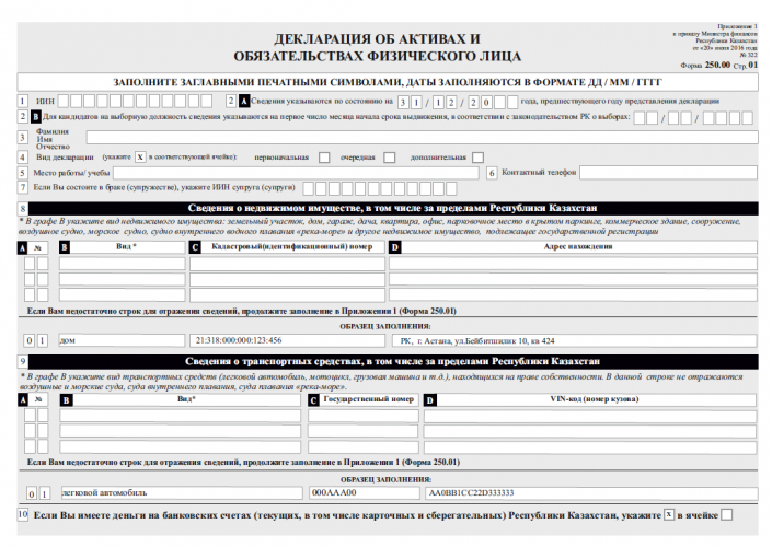 К примеру, в графе 9 "Сведения о транспортных средствах, в том числе за пределами Республики Казахстан" указывается вид транспорта (легковая, грузовая и прочее), госномер и VIN-код.