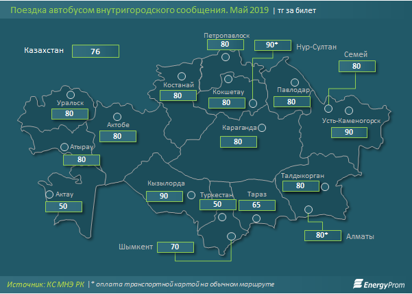 Также специалисты отмечают, что средняя стоимость проезда в автобусах Казахстана составляет 76 тенге. Больше всего приходится платить жителям Нур-Султана, Усть-Каменогорска и Кызылорды - по 90 тенге за билет. При этом в столице при отсутствии транспортной карты цена удваивается. Актобе стал единственным крупным городом Казахстана, в котором в течение года подорожал проезд, его стоимость выросла почти наполовину и составила 80 тенге.