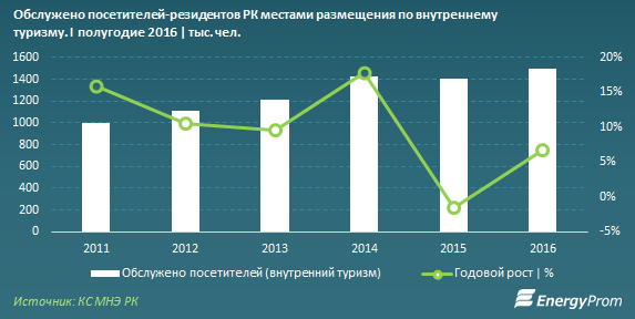 Количество внутренних туристов, обслуженных различными местами размещения за первое полугодие превысило показатели аналогичного периода 2015 года на 6,7 процента. "Показатели текущего года вновь выводят внутренний туризм в значительный плюс после небольшого спада в 2015 году (когда по итогам первого полугодия наблюдалось снижение к январю-июню 2015 на 1,5 процента). В целом, за исключением небольшого проседания в кризисном 2015 году, отрасль удерживает уверенный позитивный тренд. Показатели текущего года подтверждают успешность кластерного подхода к развитию туризма в Казахстане, который утвержден в "Концепции развития туристической отрасли до 2020 года"", - отмечают эксперты.