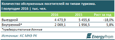 Согласно статистическим данным, за первое полугодие этого года из Казахстана за рубеж выехало 4,5 миллиона туристов. Для сравнения, в первом полугодии 2015 года были предоставлены услуги 5,5 млн выездных туристов. Эксперты связывают резко снижение год-к-году с причинами курсовой переоценки и падения реальных доходов казахстанцев. Это отразилось на внутреннем туризме. Количество обслуженных туристов составило 2,1 миллиона человек.