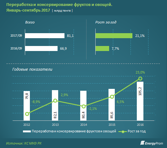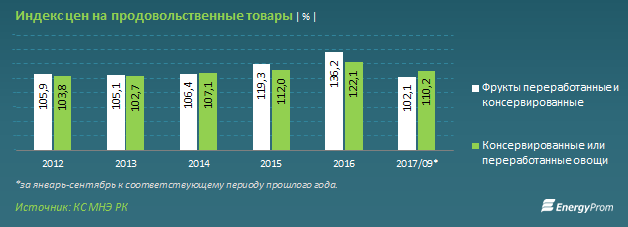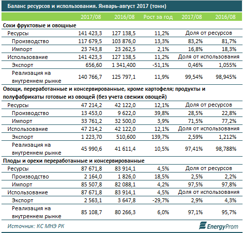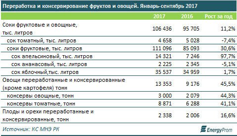 Так, по итогам восьми месяцев казахстанские компании обеспечили спрос на фруктовые и овощные соки на 83,2 процента, однако на консервированные и переработанные овощи - всего на 28,5 процента, а на переработанные орехи и плоды - всего на 2,5 процента.