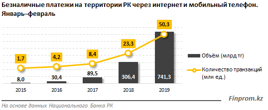 За январь - февраль 2019 года объем безналичных платежей на территории страны через интернет и мобильный банкинг достиг 741,3 миллиарда тенге - в 2,4 раза больше, чем за аналогичный период прошлого года (306,4 миллиарда тенге). Доля безналичных платежей через интернет и мобильный банкинг составила 61,7 процента от общего объема. За два месяца текущего года через интернет и мобильный банкинг было проведено 50,3 миллиона транзакций, годом ранее - всего 23,3 миллиона.