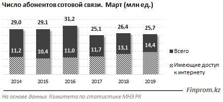 Мобильным интернетом пользуются 56 процентов всех абонентов сотовых операторов РК. На конец марта текущего года число абонентов сотовой связи сократилось на 2,7 процента год к году и составило 25,7 миллиона единиц. В конце марта 2018 года количество абонентов достигало 26,4 миллиона, увеличившись за год на 5 процентов.