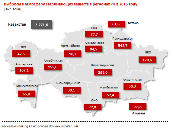 Самая тяжелая ситуация с состоянием окружающей среды среди регионов РК в Карагандинской области - в 2016 году здесь в атмосферу было выброшено порядка 593 тысяч тонн загрязняющих веществ, или 26,1 процента от всего объема по Казахстану. Однако за 2016 год объем выбросов несколько сократился - на 3,3 тысячи тонн, или на 0,6 процента.