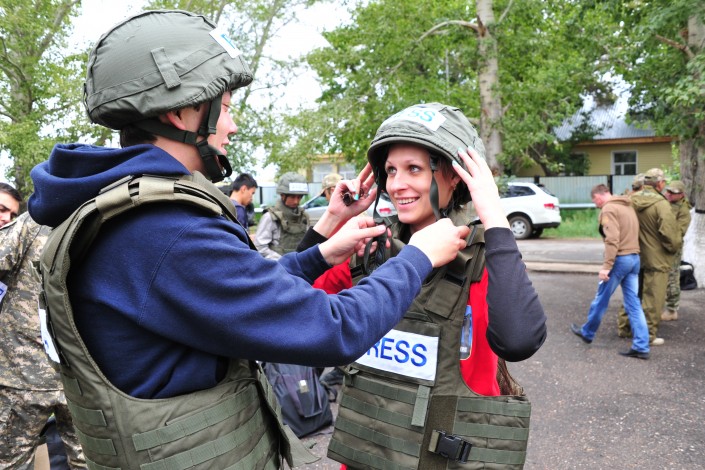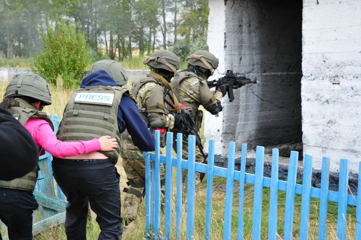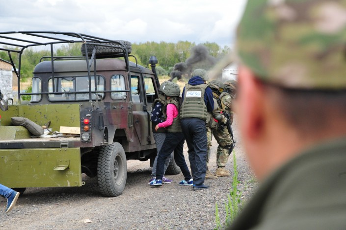 Так, в первый день представителям СМИ рассказали о том, как вести себя в горячих точках, какой статус должен быть у журналиста, что нужно иметь при себе и как подготовиться психологически. Репортеров оснастили амуницией - 16-килограммовыми бронежилетами и касками. Именно в таком обмундировании должен работать журналист в зоне военного конфликта. В этот же день на автобус с представителями СМИ "напали" террористы и похитили одного из репортеров.