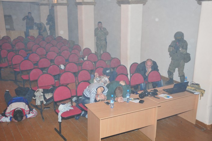 Во второй день семинара журналистов "захватили террористы". Все происходящее было максимально приближено к реальности. Во время обсуждения просмотренного фильма о группировке ИГИЛ в учебный зал ворвались неизвестные люди в масках и открыли стрельбу. Всем журналистам было приказано опустить головы. Попытки самых отважных корреспондентов и операторов, которые осмелились снимать происходящее на камеру мобильного телефона или поднять голову, тут же были пресечены. Для пущего эффекта "террористы" "расстреляли" военных инструкторов Министерства обороны. Журналистов-заложников освободили бойцы спецназа, которые "ликвидировали" боевиков. Представителей СМИ по одному вывели на улицу и уложили на асфальт. На этом спецоперация закончилась.