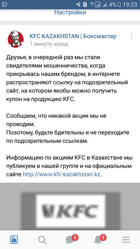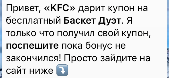 Накануне в мессенджере WhatsApp казахстанские пользователи начали массово рассылать сообщение про якобы бесплатный Баскет Дуэт. "KFC дарит купон на бесплатный Баскет Дуэт. Я только что получил свой купон, поспешите пока бонус не закончился! Просто зайдите на сайт ниже", - говорится в тексте рассылки.