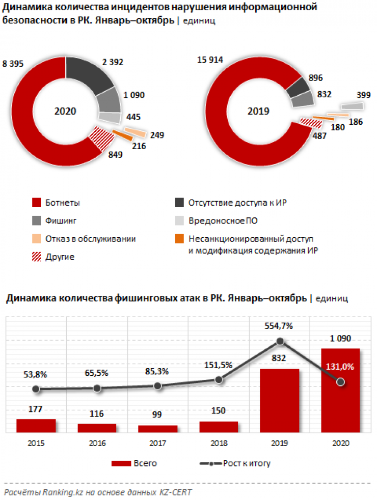 По данным портала, с января по октябрь в стране было выявлено 1090 фишинговых атак, в аналогичном периоде прошлого года - 832. При этом за соответствующий период 2018 года было зафиксировано всего 150 атак, 2017-го - 99 атак, 2016-го - 116 атак.