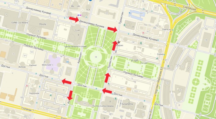 "Улицы Туркестан и Акмешит, Кунаева и Достык - эти четыре улицы с односторонним движением мы будем запускать до Дня города. Туркестан будет (односторонней) в направлении улицы Сарайшык, Акмешит - вверх в сторону аэропорта. Улица Кунаева будет в направлении Дома министерств, а Достык - в сторону ТРЦ "Хан Шатыр", - сообщил руководитель Управления транспорта и развития дорожно-транспортной инфраструктуры Астаны Асхат Карагойшин.