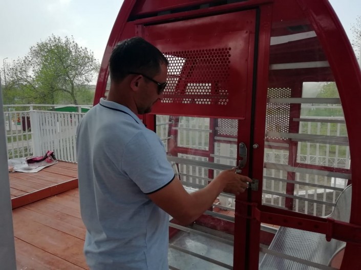Для безопасности на кабинке снаружи установлены два замка и решетки, чтобы во время остановки колеса люди в панике не могли выпрыгнуть наружу. Также на аттракционе есть три аварийных режима прокрутки колеса, заверили в компании.