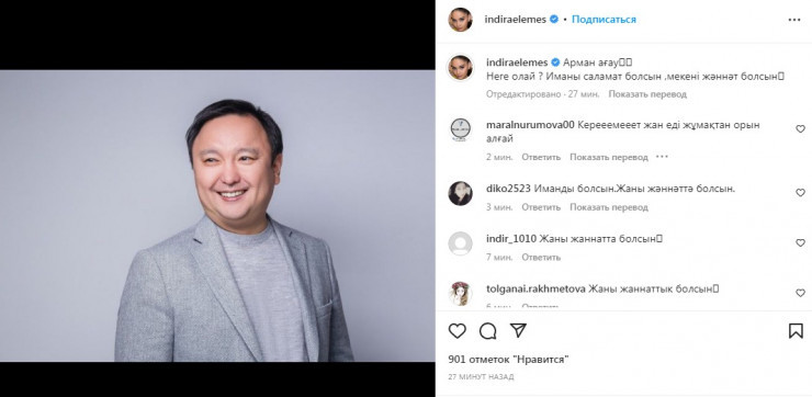 "Арман ағау. Неге олай? Иманы саламат болсын, мекені жәннәт болсын!" - деп жазды әнші Индира Елемес Желіде.