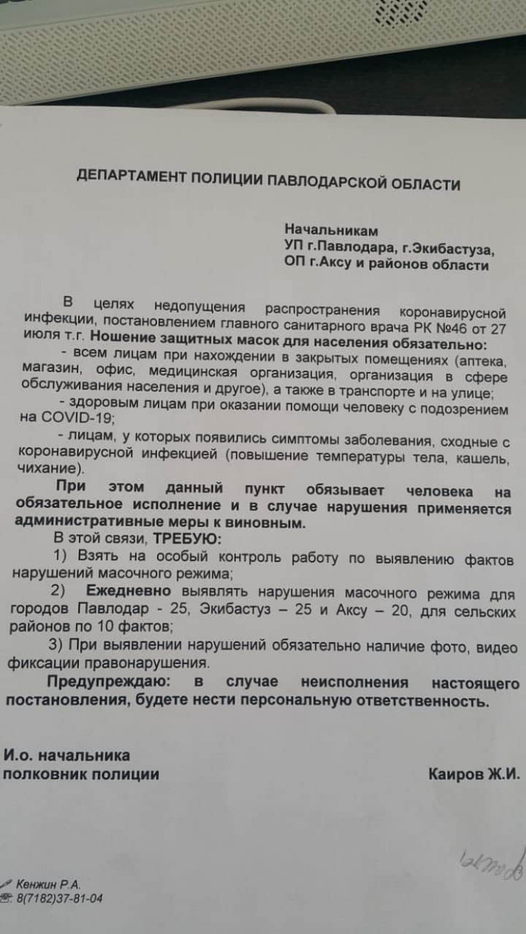 "Маска режимін бұзғандарды қатаң бақылауға алуды тапсырамын. Күніне Павлодар қаласында - 25, Екібастұзда - 25, Ақсуда - 20, ауыл-аймақтарда 10 деректен анықталып отырсын", - делінген құжатта.