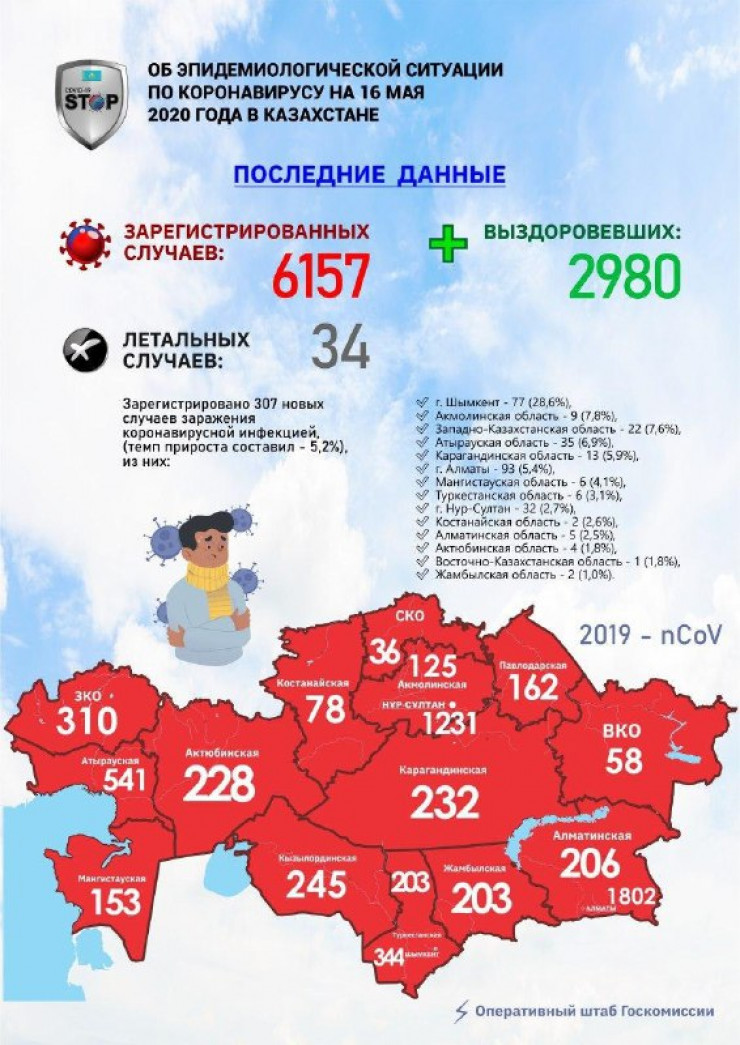 "За прошедшие сутки в Казахстане выявлено 307 заболевших коронавирусной инфекцией. Прирост составил 5,2 процента", - говорится в сообщении.