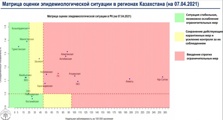 На 6 апреля в "красной" зоне находятся восемь регионов: Нур-Султан, Алматы, Атырауская, Акмолинская, Алматинская, Актюбинская, Карагандинская и Западно-Казахстанская области.