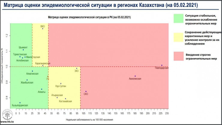 По данным на 5 февраля, в "красной" зоне остаются Акмолинская, Павлодарская, Северо-Казахстанская области.