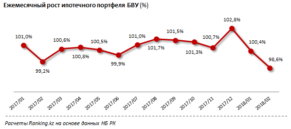 Чистый портфель кредитов в строительном секторе (без просрочки) с сентября 2017 года по февраль 2018-го сократился на 22 процента, до 658,5 миллиарда тенге.