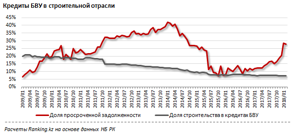 Такой всплеск токсичных кредитов в отрасли впервые наблюдался в период зарождения большого кризиса в жилстрое в середине 2009 года, когда за пять месяцев доля просроченной задолженности подскочила с 10 до 22 процентов. После этого кредитование строительства вошло в многолетнюю стагнацию. Если в 2009 году строительный сектор в портфеле банков занимал 20 процентов, то на текущий момент - всего 7,3 процента.