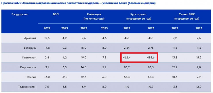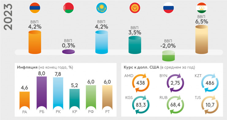 Аналитики банка ожидают дальнейшую адаптацию экономик стран региона к изменившимся условиям. Прогнозируется следующая экономическая динамика в 2023 году: сокращение ВВП России - на 2 процента, рост ВВП Армении - на 4,2 процента, Беларуси - на 0,3 процента, Казахстана - на 4,2 процента, Кыргызстана - на 3,5 процента и Таджикистана - на 6,5 процента.