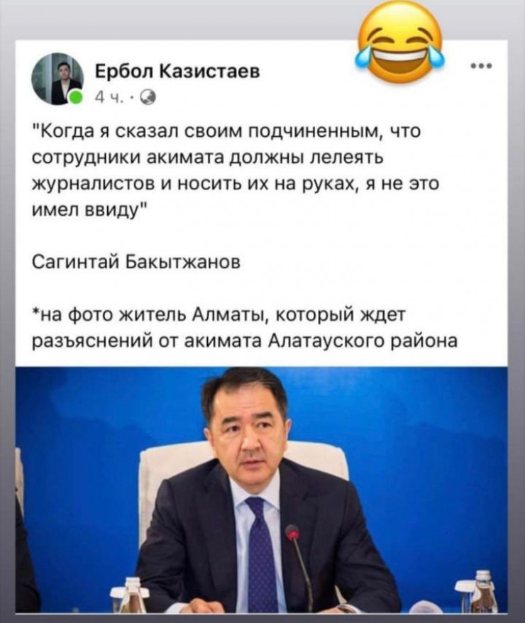"Мен қарамағымдағы адамдарға әкімдік қызметкерлері журналистерді алақанында аялап ұстау керек дегенімде, мұны айтпаған едім", - дейді Сағынтаев мемде.