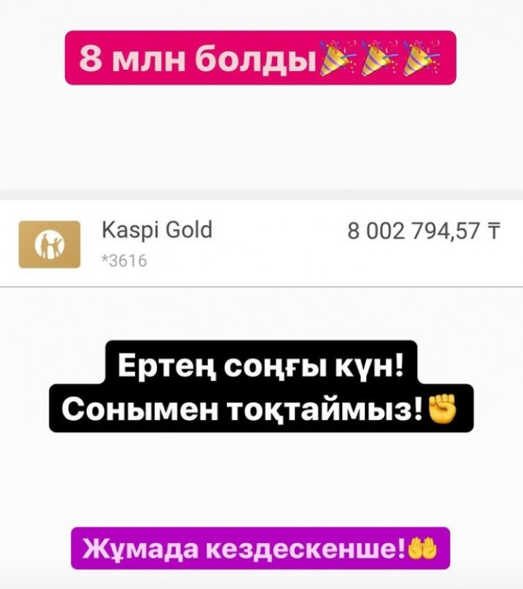 Блогер Асылхан Дукенбаев в сториз в Instagram рассказал, что сбор денег будет закончен 11 февраля в 13 часов.