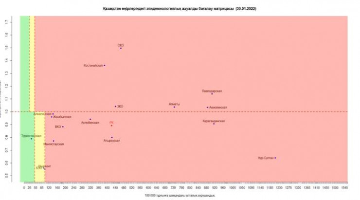 Кызылординская область перешла из "красной" зоны в "желтую", передает Tengrinews.kz со ссылкой на данные матрицы оценки эпидемиологической ситуации в регионах Казахстана на 30 января 2022 года.