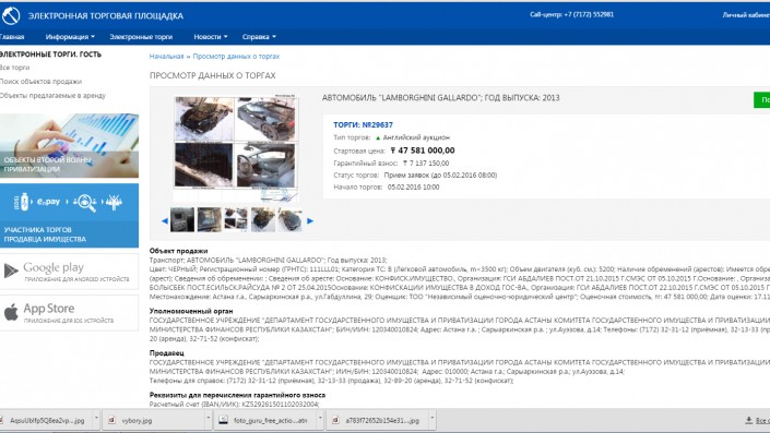 Объявление о продаже автомобиля размещено на сайте gosreestr.kz. Продавцом Lamborghini Gallardo выступает Департамент государственного имущества и приватизации Астаны Комитета государственного имущества и приватизации Министерства финансов РК. На сайте указан тип торгов - английский аукцион. Гарантийный взнос для участников торгов составляет - 7 137 150 тенге. Торги назначены на 5 февраля 2016 года. На сайте в разделе "Примечание" указано, что ключи от автомобиля "отсутствуют".