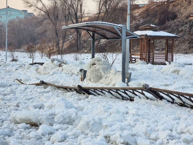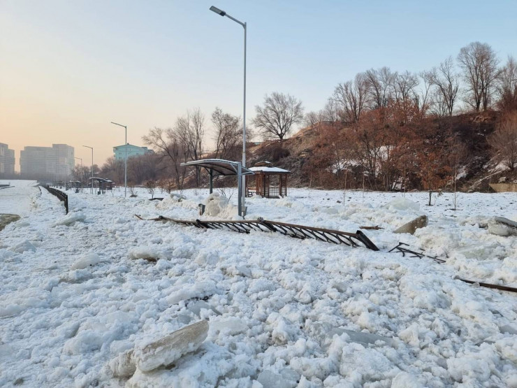 "Это состояние набережной реки Есентай, чуть выше проспекта Аль-Фараби. Там сошел лед, сбил ограждение, и пешеходная дорога сейчас вровень с уровнем реки заполнена глыбами льда. Это была ледяная лавина", - сообщила автор фотографий.