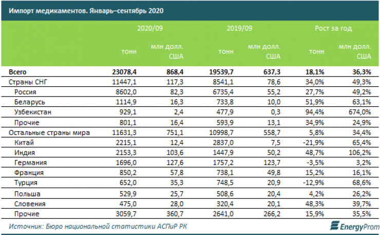 Из стран СНГ Казахстан импортировал 11,4 тысячи тонн медикаментов на сумму 117,3 миллиона долларов. Основными экспортерами в Казахстан из стран СНГ стали Россия, Беларусь и Узбекистан.