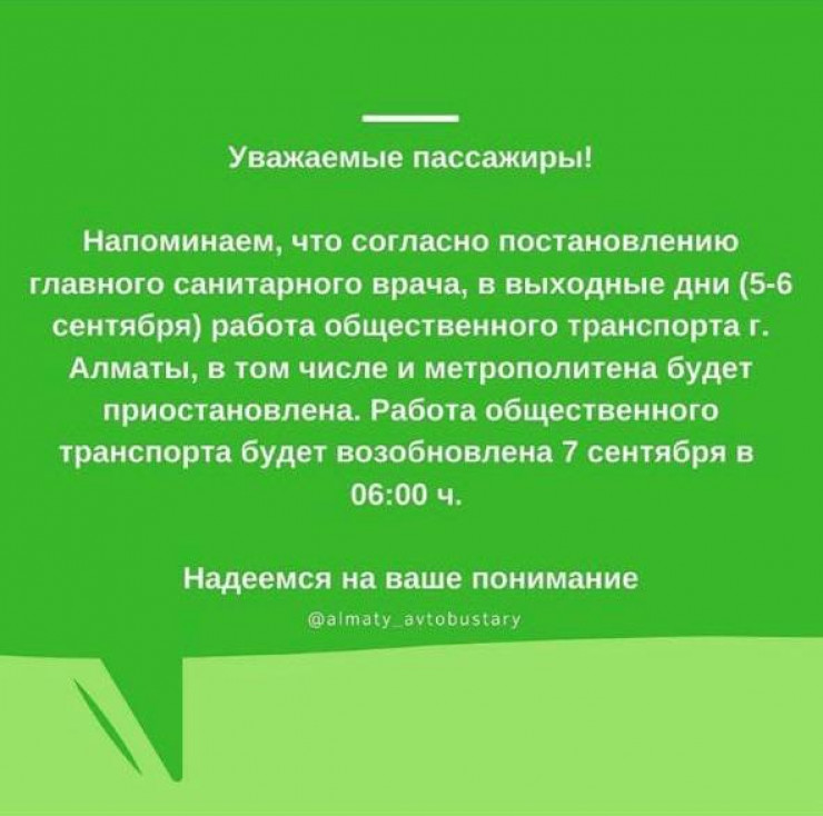 Что касается Алматы, в социальных сетях акимата Алматы есть объявление, что 5 и 6 сентября 2020 года общественный транспорт работать не будет.
