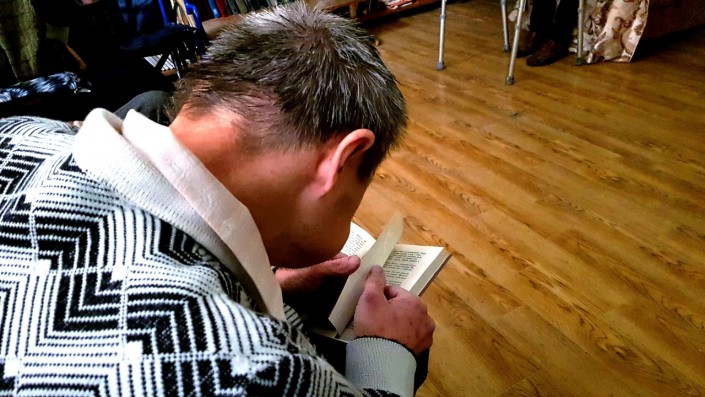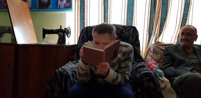 В нем Виталий живет больше полугода. Сначала он был немного напуган, но быстро привык к здешним правилам и людям. Видно, что жизнью большой ребенок доволен: у него есть любимые игрушки, а на Новый год подарок ему принес сам Дед Мороз. Тех, кто за ним ухаживает, Виталий называет мамами и папами. Читать он не умеет, зато блестяще подражает собравшимся в библиотеке: сосредоточенно смотрит в книгу, слюнявит палец, перелистывает страницы, бормочет что-то под нос и хмурит брови. А еще любит петь и танцевать: маленькие концерты с восторгом встречают и сотрудники, и жители центра.