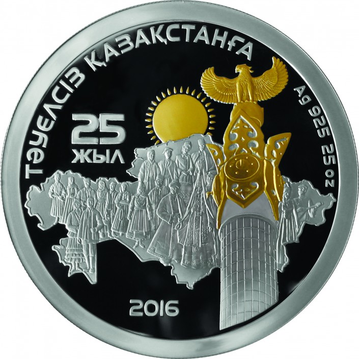 Напомним, реверсе монеты изображены географический контур Казахстана, который заполнен изображениями людей в национальных костюмах, восходящее над ним солнце и фрагмент монумента "Қазақ Елі", а также надпись на казахском языке "Независимость Казахстана 25 лет". Цельная композиция символизирует единство народа Казахстана.